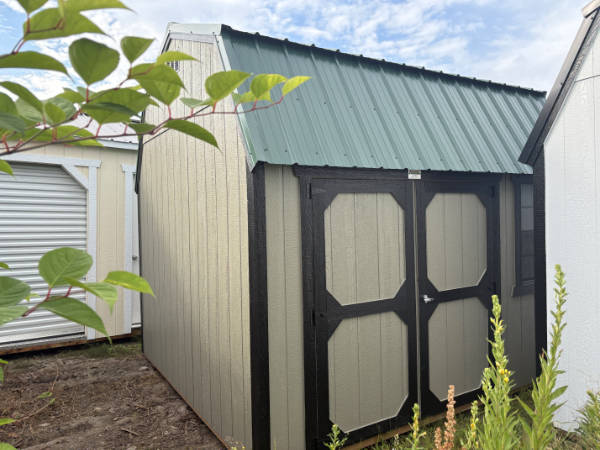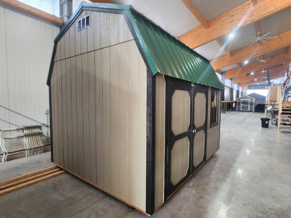 A674 Lofted Barn 10×12 Hardware Grey with Black Trim and Hunter Green roof – no permit required