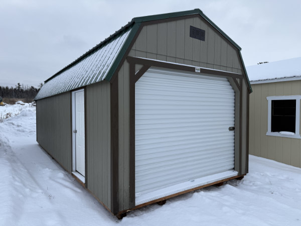A941 Roll Up door on Lofted Barn 12×28 Hardware, Dark Clove Trim, and Hunter Green Roof – a permit is easy